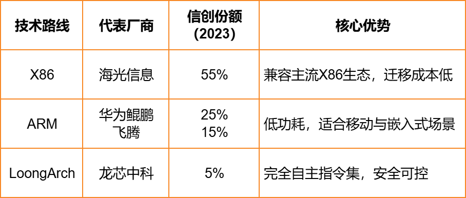 国内CPU市场受信创政策推动,形成X86、ARM、LoongArch三大技术路线并行的格局。