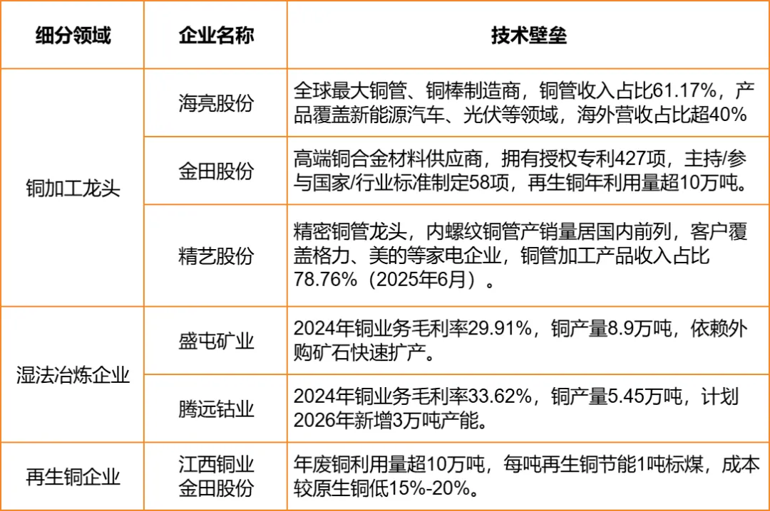 细分领域龙头通过聚焦高端材料、湿法冶炼或再生铜利用形成独特竞争力。