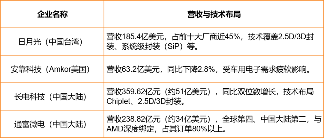 全球封测市场集中度较高,前十大厂商合计营收占比超70%,其中中国台湾、中国大陆及美国企业占据主要地位。