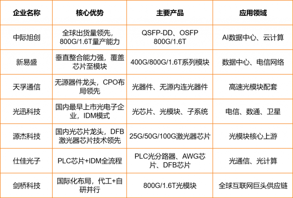 中国厂商在全球光模块市场占据主导地位,核心企业覆盖芯片、器件、模块全链条。