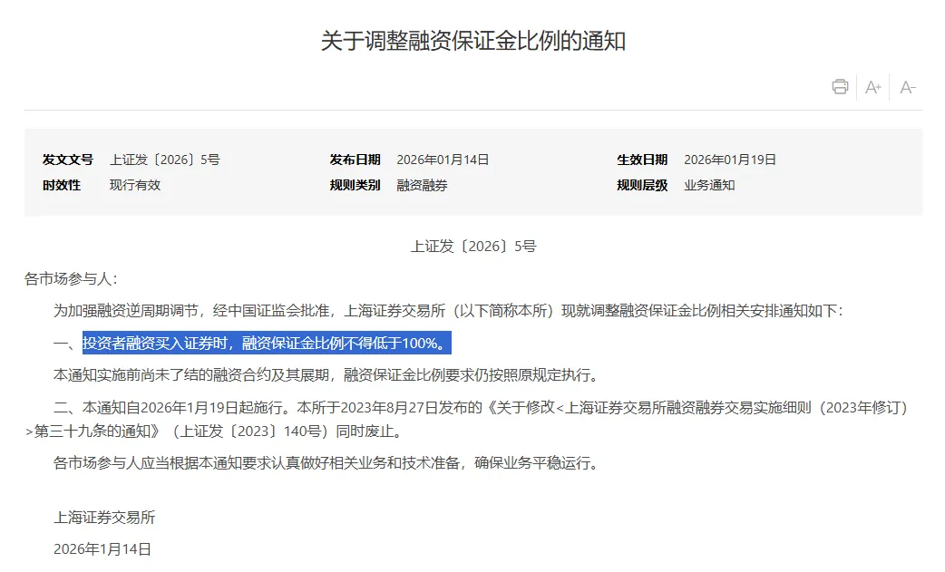 沪深北交易所1月14日午间发布通知,经中国证监会批准,将投资者融资买入证券时的融资保证金最低比例从80%提高至100%,旨在通过逆周期调节降低市场杠杆水平。此次调整仅适用于新开融资合约,存量合约不受影响。