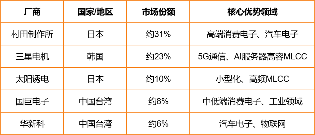 全球MLCC供给端高度集中,前五大厂商占据超80%市场份额,其中日本村田、韩国三星电机、日本太阳诱电等日韩企业长期主导高端市场。