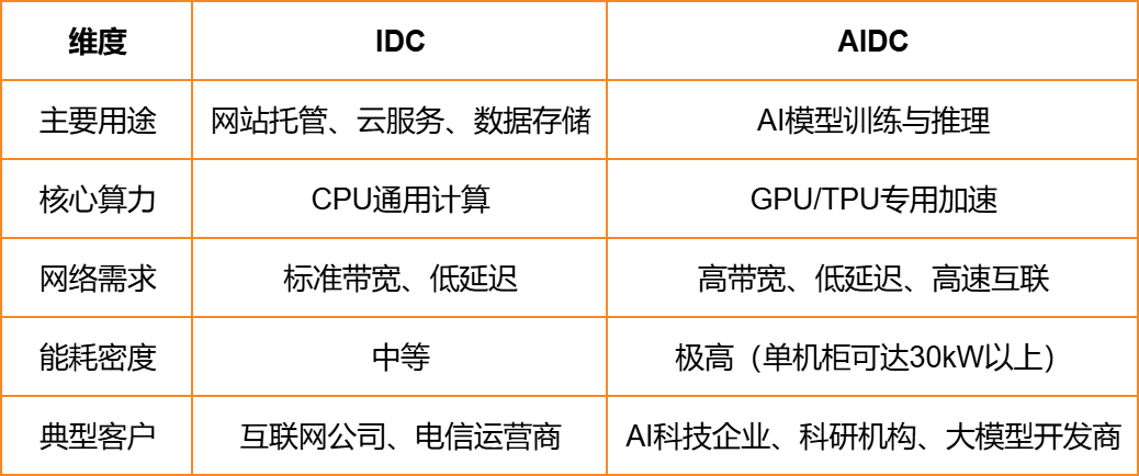 IDC(Internet Data Center,互联网数据中心)和 AIDC(Artificial Intelligence Data Center,人工智能数据中心)是两类不同定位的数据中心,主要区别体现在其服务对象、技术架构与算力需求上。