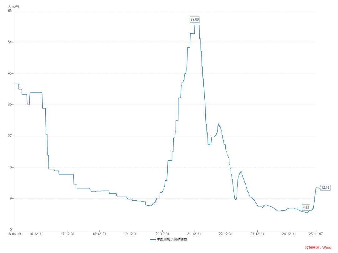 截至2025年11月7日,六氟磷酸锂价格报12.15万元/吨,较2025年7月低点4.95万元/吨累计上涨145%,呈现强劲反弹态势。价格自10月起加速上行,单月涨幅近100%,创下近三年新高。