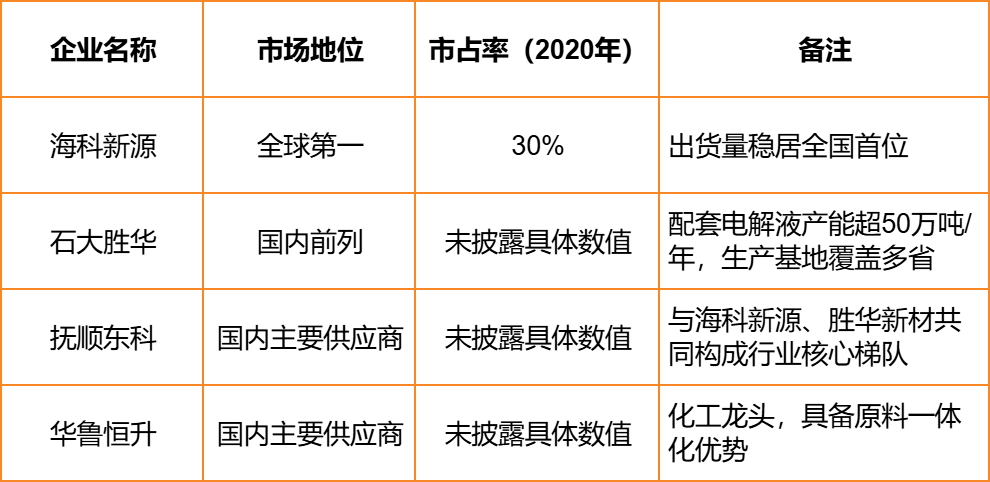 目前中国电解液溶剂市场呈现出高度集中且稳定的格局。海科新源、石大胜华、抚顺东科和华鲁恒升四家企业合计占据超70%的市场份额。龙头企业海科新源凭借先发优势、技术实力和规模效应,占据了绝大部分市场份额,其全球销售市场份额为30%。