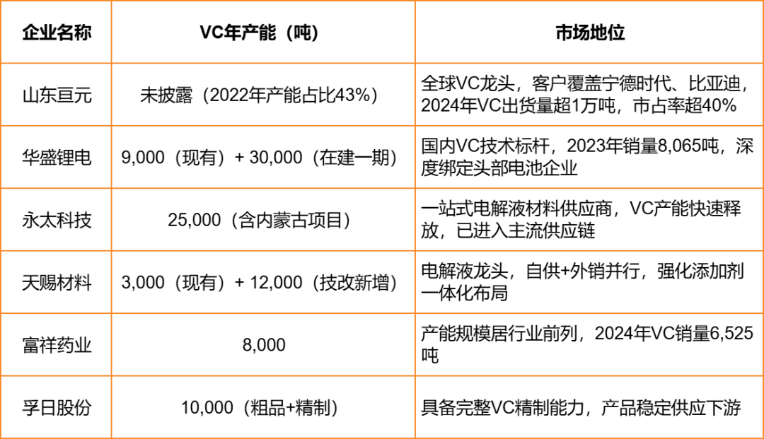 碳酸亚乙烯酯(VC)市场集中度高,头部企业凭借技术壁垒与产能规模占据主导地位。根据2022年行业产能数据,山东亘元以43%的全国产能稳居首位,华盛锂电与永太科技分列第二、三位。