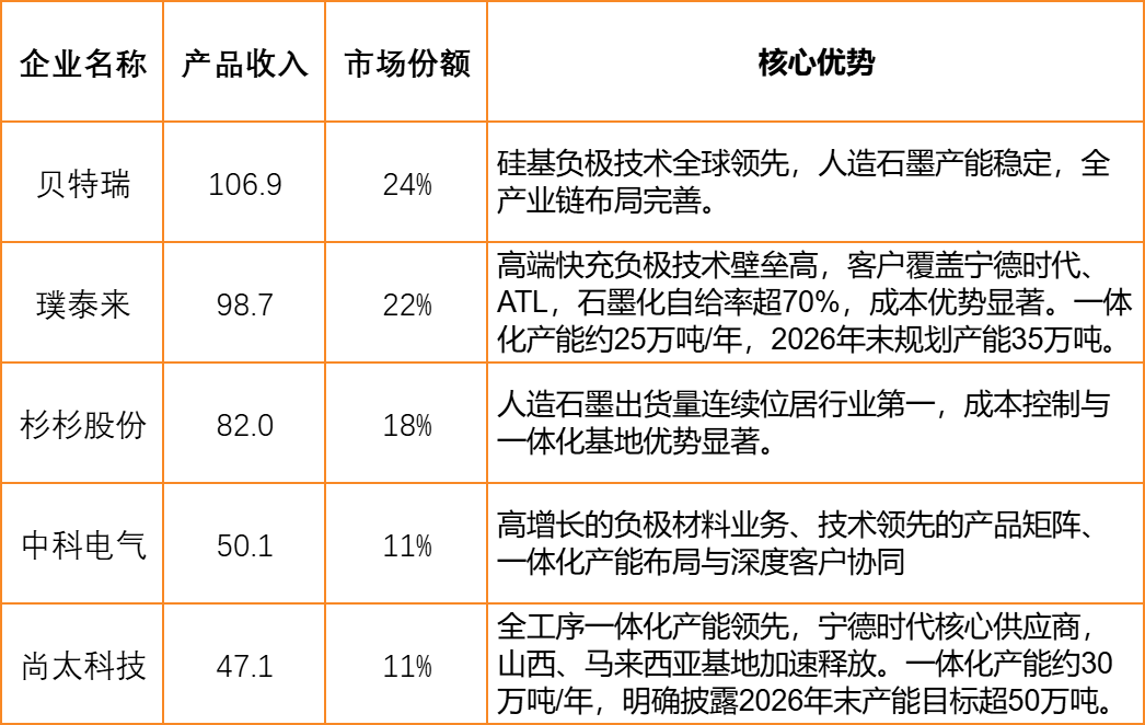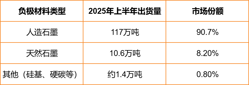负极材料 2025年11月16日 锂电池负极材料市场以人造石墨为主导,天然石墨为辅,硅基等新型材料加速渗透。 2025上半年,中国负极材料仍以人造石墨为主,人造石墨出货量达117万吨,占整体市场的90.7%。天然石墨材料出货达10.6万吨,占比达8.2%。 行业集中度持续提升,贝特瑞、璞泰来、杉杉股份、中科电气、尚太科技等企业2024年负极材料收入较高,行业毛利率21%左右。 风险提示:以上内容仅供参考,不构成投资建议。
