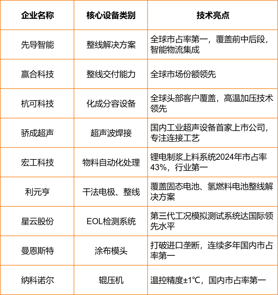 以先导智能、赢合科技、利元亨为代表的企业,凭借覆盖锂电池前中后段的全工序设备能力及全球客户资源,占据市场主导地位。其中,先导智能市值居行业首位,产品远销欧美日韩等主流电池厂商,持续引领全球智能装备解决方案。