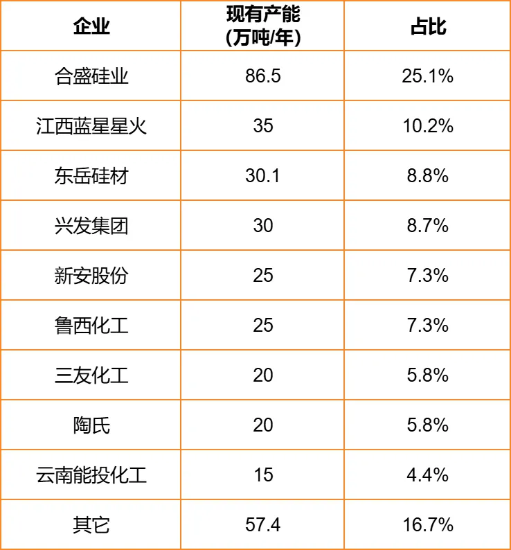 据百川盈孚数据,截至2024年12月,国内有机硅行业总产能达到344万吨(折DMC),产能CR5、CR8分别达到60%、79%,整体处于较高水平。